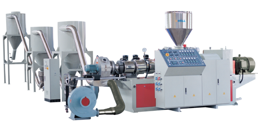 This pelletizing machine is composed by a conical twin-screw extruder and the correspondingly pelletizing downstream equipment, it is suitable for the pelletizing of PVC, PE raw materials with wood powder or other additives. The pellets produced by this machine is evenly, solid and elegance. The pelletizing downstream equipment is the die face cutter, air transferring unit, vibration separating and cooling unit. This pelletizing downstream equipment has the features of high automation and high production efficiency.